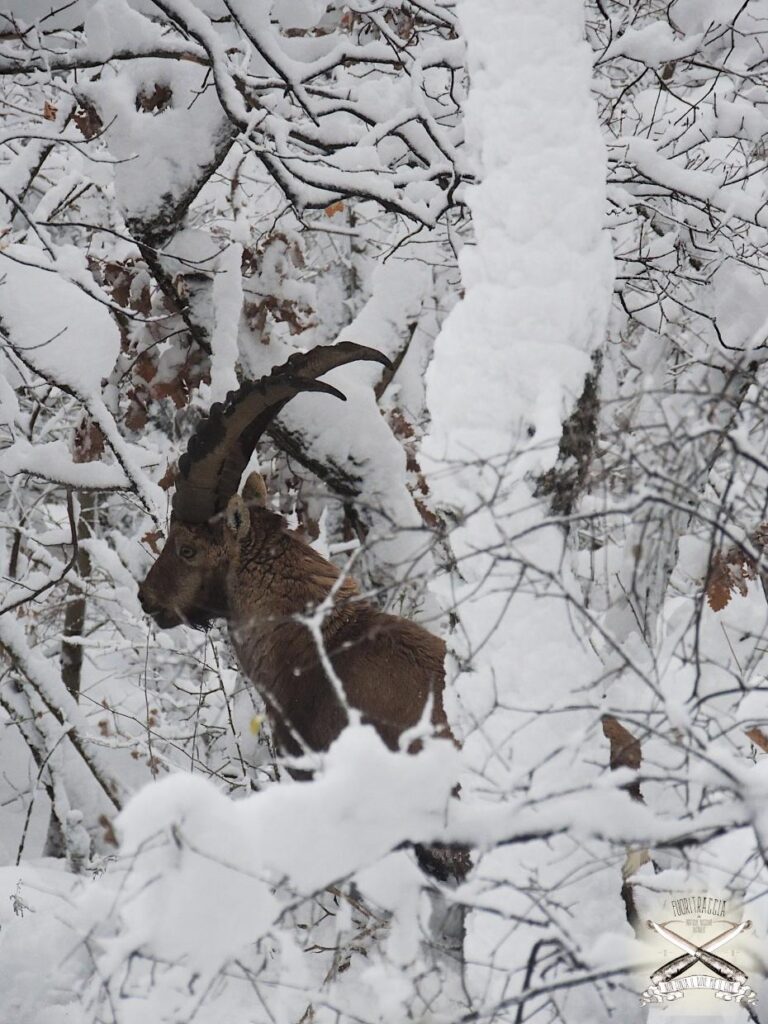 Procedo fra rami carichi e panorami da cartolina quando il mio sguardo viene attratto naturalmente dalle tracce che a questo punto mi procedono, non capisco di chi si tratti, se stambecco, le cui orme a tratti sono chiare, o camoscio a momenti parimenti intelligibili, ma in tutto ciò qualcosa mi confonde, pare un’unica traccia di un animale poli-ungulato, che esista un’altra bestia mitica oltre al Daù? Il mistero è presto svelato quando un fischio penetrante attira la mia attenzione sul fuggi, fuggi in corso nel bosco appena a margine del sentiero, un branco misto e molto ampio di stambecchi e camosci: fuggono tutti e tutte, ad eccezione di due maschi che, a distanza di sicurezza mi controllano…
